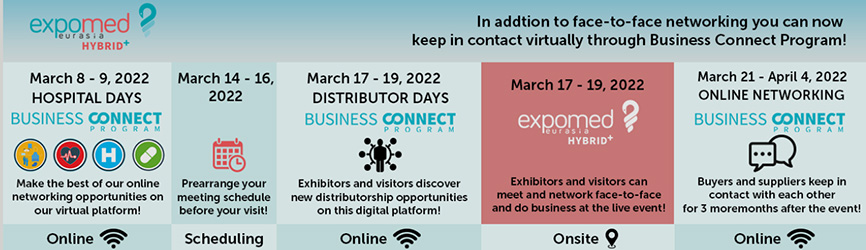 Expomed Eurasia 2022, the 29th international exhibition for medical, diagnostic, laboratory and hospital equipment, will be held in Istanbul, Turkey, from March 17 to March 19, 2022. For almost 30 years, Expomed Eurasia has become the leading medical exhibition not in Turkey alone, but in the whole Eurasian region.